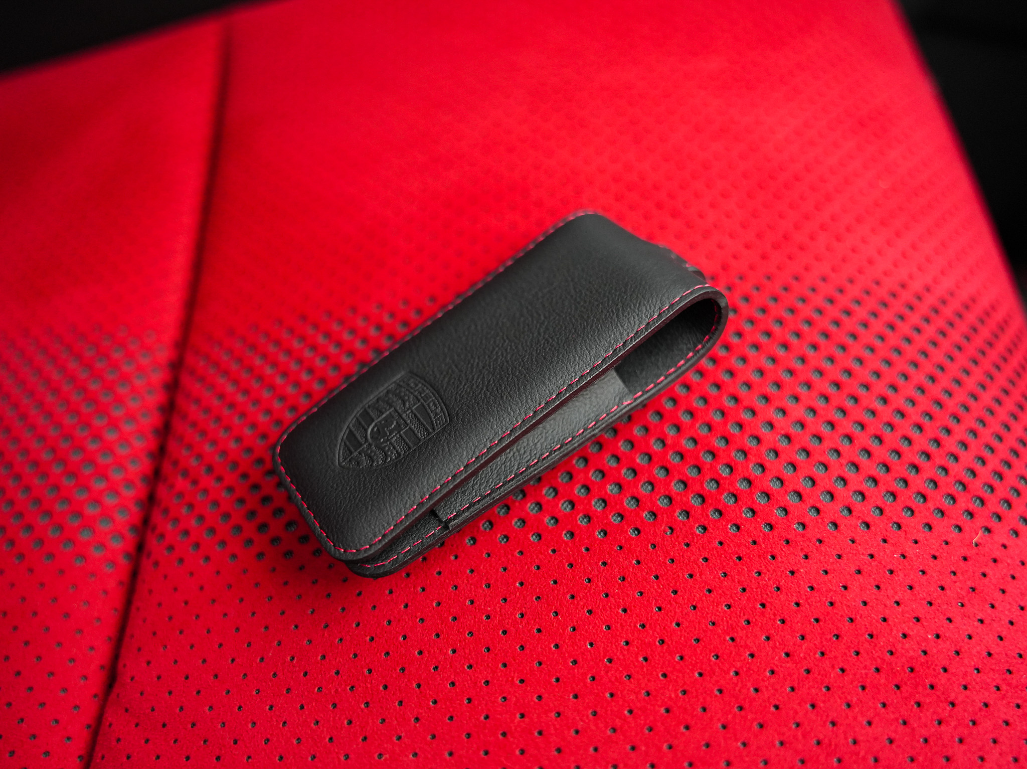 - BYE Clés peintes en couleur carrosserie avec étui en Cuir et coutures en Rouge Carmin